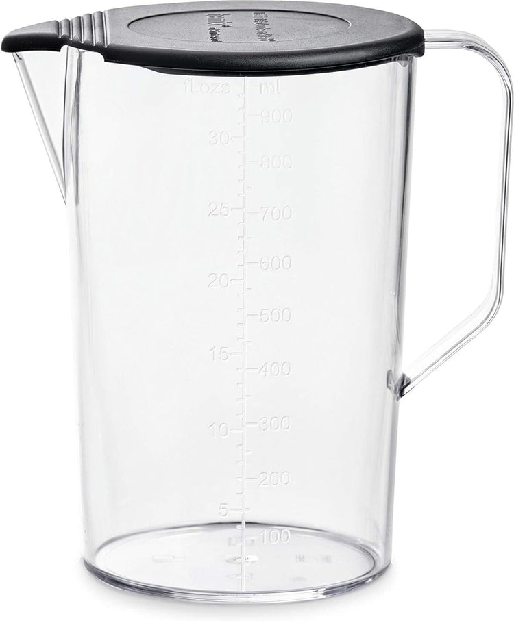 The Bamix® 1L Jug is a versatile kitchen accessory built for use with your Bamix immersion blender. Made from food-grade material, the jug is not only shatter-proof but also heat resistant up to 150°C, making it reliable for all your blending and storage needs. With its snap-on lid, this jug allows you to blend as well as store in the same container. It's dishwasher safe, freezer safe, and can even be used in the microwave. This practical jug also highlights a precision-pour spout and measuring scale markings, making it both easy to use and clean.