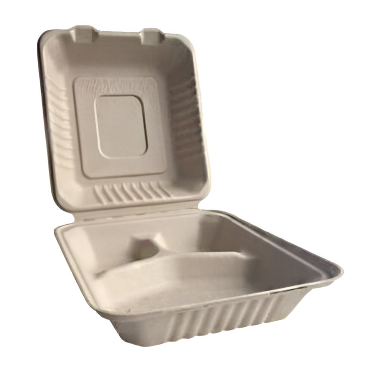 The Better Earth 8" x 8" Bamboo 3 Compartment Paper Hinged Container offers a sustainable and eco-friendly packaging solution for your food service needs. Made from natural bamboo fibers, this container is fully compostable and biodegradable, making it an excellent alternative to plastic and Styrofoam. The three-compartment design allows for easy separation of food items, preventing cross-contamination and maintaining freshness. Its sturdy, hinged lid ensures secure closure and convenient on-the-go use. Ideal for restaurants, cafes, or takeout services committed to reducing their environmental impact.