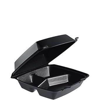 Keep your meals organized and fresh with the Dart Container - 8.4" x 7.9" x 3.3" 3 Compartment Black Foam Hinged Container. Designed for convenience and durability, these containers are perfect for takeout, catering, and meal prep. Each container features three compartments to keep food items separate and secure, ensuring that your dishes arrive just as they were intended. The sturdy foam construction offers excellent insulation, keeping hot foods hot and cold foods cold. With a secure hinged lid, these containers are easy to close and provide a tight seal to prevent leaks. Sold in packs of 200, they are a cost-effective solution for businesses or large gatherings.