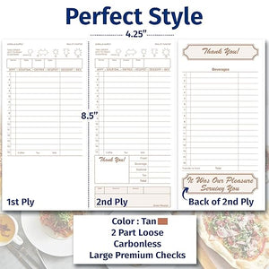 Upgrade your restaurant or café's service with the Direct Paper Supply - 4.25" x 8.5" CCT-T4997-SP 3 Ply Carbonless, Perforated Tan Guest Checks, Pack of 250 - DIRT4997SP. These high-quality guest checks are essential for ensuring accurate order-taking and efficient service. Designed with a perforated edge for easy separation, these 2-ply carbonless checks provide a duplicate copy without the need for messy carbon paper, making record-keeping a breeze. The sturdy tan paper is durable and easy to write on, offering a professional look and feel for your business.