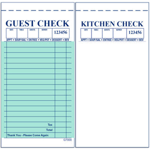 Efficiently manage your restaurant's guest orders with the Direct Paper Supply CT-G-7000 2 Part Green Carbonless Guest Checks. Designed for seamless use in busy dining environments, these guest checks feature a two-part carbonless design, ensuring a clear copy of every order for both the kitchen and the guest. Each case includes 50 books, with 50 checks per book, providing ample supply to keep your operations running smoothly.