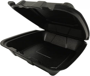 Upgrade your food packaging with the Ecopax 8.5" x 8.25" x 3.75" Black 1 Compartment Foam Hinged Container. Designed to provide reliable performance for takeout and delivery, this container is perfect for restaurants, cafes, and food trucks. The one-compartment design is ideal for keeping your food secure and intact during transportation, ensuring that customers enjoy their meals just as intended.