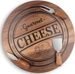 reliable for wine & cheese parties, this all-in-one cheese board set has everything you need to prepare as well as serve. Each of the 3 included knives have different characteristics for cutting through different types of cheese. The solid wood board is made from long-lasting Acacia wood and highlights a rustic style graphic. The pointed knife has a versatile design for cutting semi-firm to hard cheese and it is also great for spreading soft cheese on crackers & bread. The wide knife is used to cut or divide soft cheese and also works as a chisel for shaving down on hard cheese. Lastly the fork is used to hold cheese in place while cutting & for serving and it can also be used to break apart crumbly cheese.