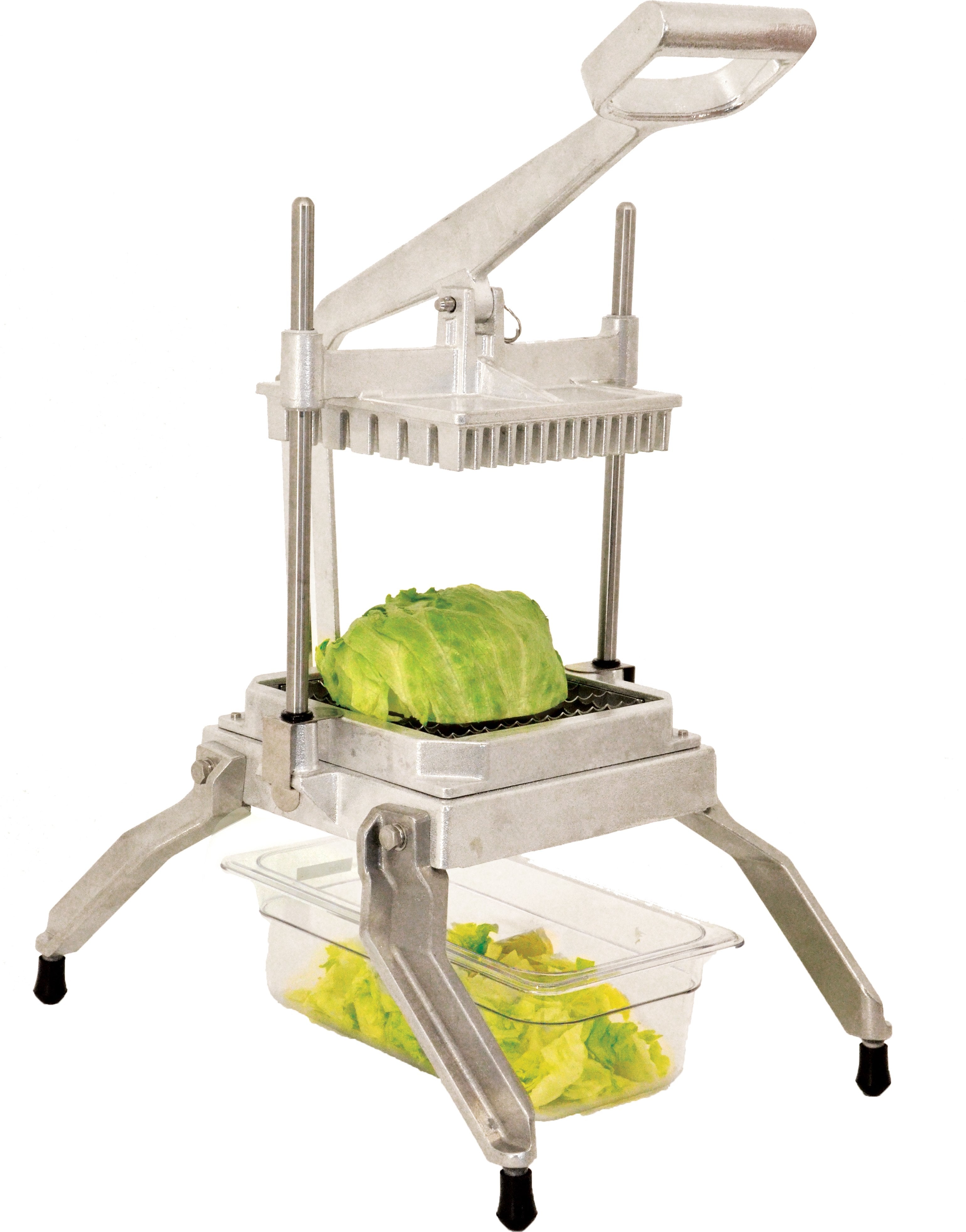 quickly cut lettuce in a short amount of time. The pusher quickly disassembles for easy cleaning. The sharp scalloped blades are designed to cut one-inch squares with no bruising as well as crushing. This cutter comes with non-skid feet for added stability. Great for lettuce, cabbage, onions, bell peppers, cucumbers, cantaloupes and even cooked chicken.