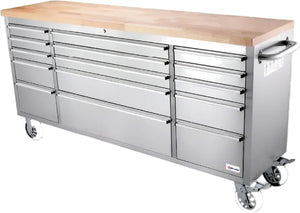 Maximize your storage as well as workspace with the Omcan 72" Mobile Working Bench featuring 15 drawers in a sleek, heavy-duty design. The spacious rubberized wood top offers a long-lasting and slip-resistant surface, well-suited to food prep, tool organization, or mechanical projects. Built from high-quality 430 stainless steel, this mobile workbench is designed to perform in both professional and residential settings, including outdoor patios, garages, workshops, and commercial kitchens. With 15 aluminum drawers equipped with ergonomic handles, you’ll have abundant organized storage for tools, equipment, and supplies. The bench’s mobility helps deliver that you can quickly reposition it as needed, making it a flexible and essential component for dynamic work environments.