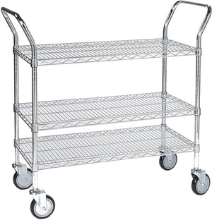 Utility Cart, 3-tier, 60"W x 24"D x 38"H, is a durable, heavy-duty solution for transporting packages, supplies, and equipment. Designed for demanding environments, it supports loads up to 1,200 lbs; has a chrome finish for added durability and corrosion resistance; rolls smoothly on four 5-inch heavy-duty swivel casters; includes U-shaped push handles for comfortable control and easy maneuverability.